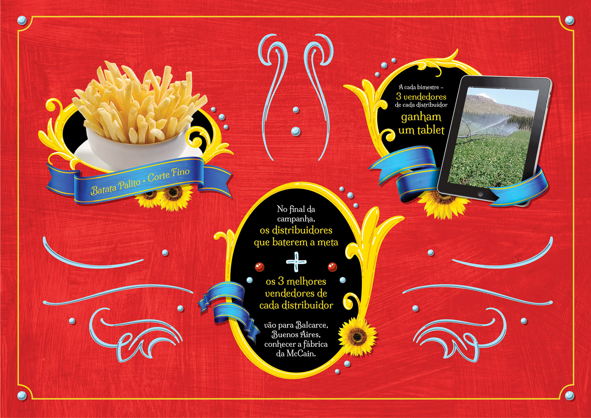 Art direction of a sales incentive program for McCain Foods Brazil inspired by the visual of Fileteado Porteño, from Argentina. A popular style of ornaments from Buenos Aires. The best salesmen win a trip to Argentina to visit McCain's farm and factory.