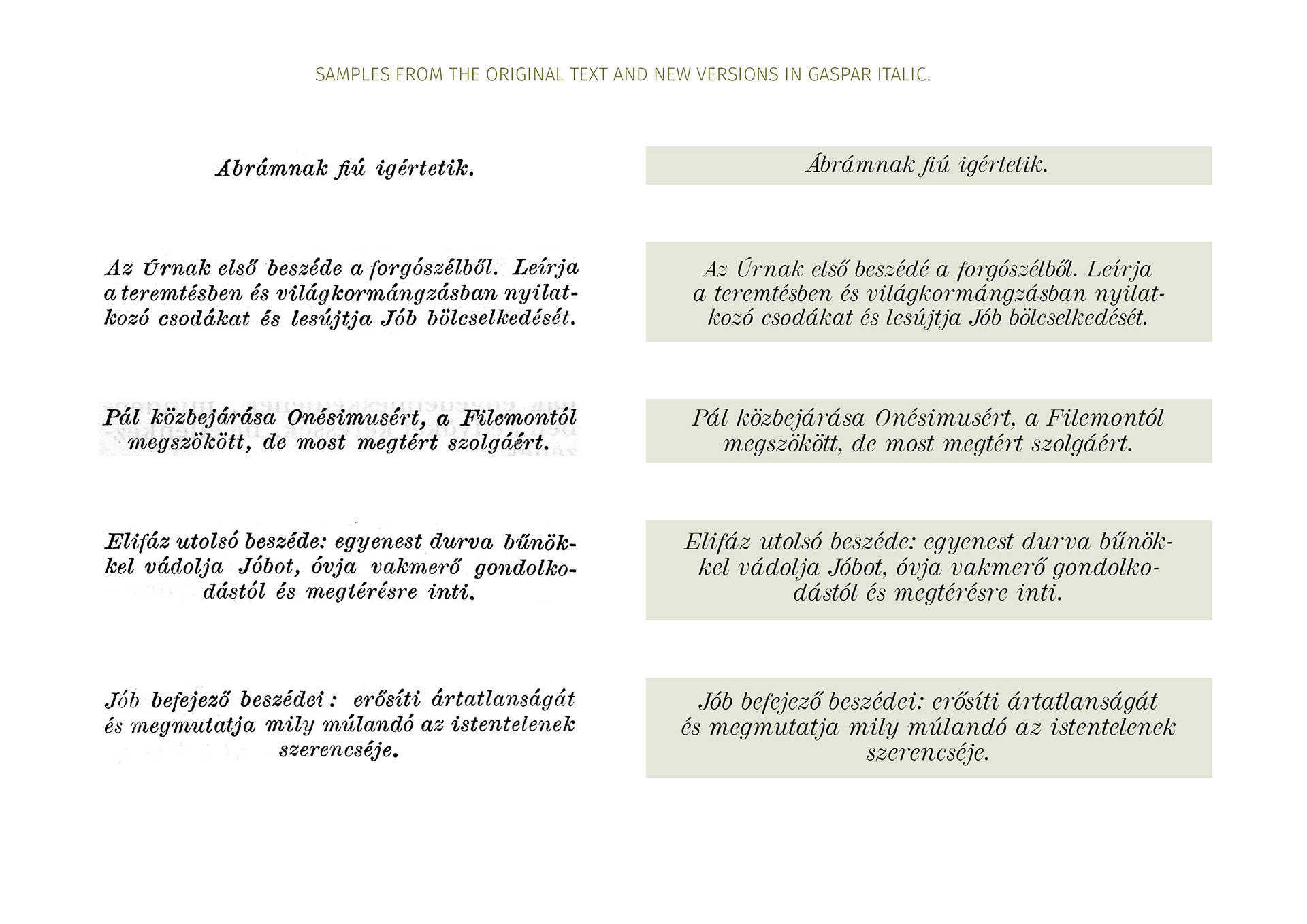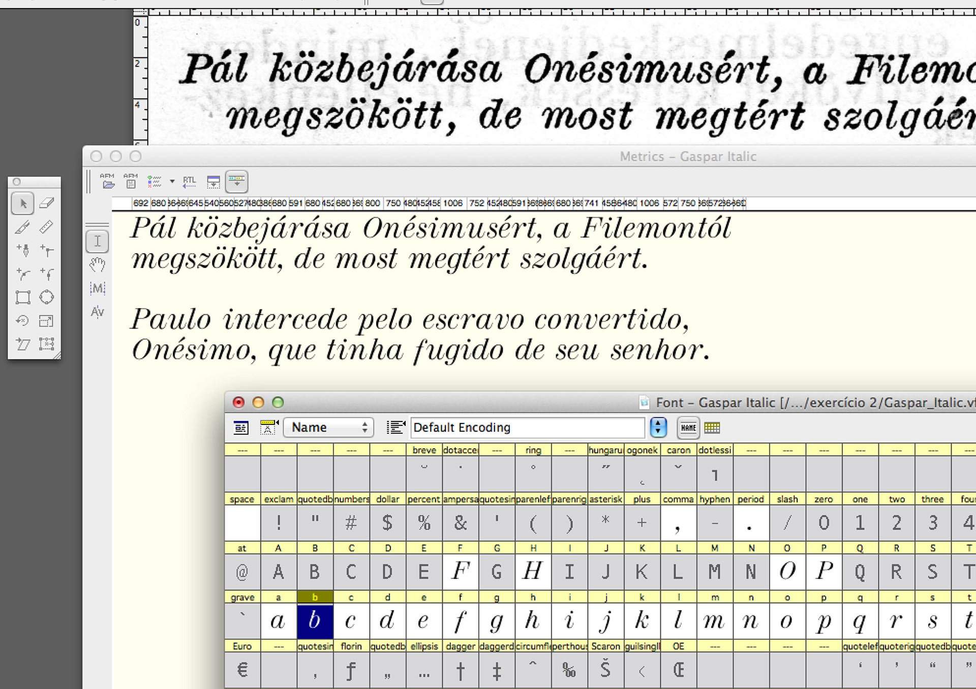 Gaspar Italic is a typeface inspired by the italics found in a hungarian Holy Bible. The book was printed in 1914 with metal type. This project was developed in the SENAC-SP Postgraduate Studies in Typography, during Type Design 2 - texts and publications discipline.