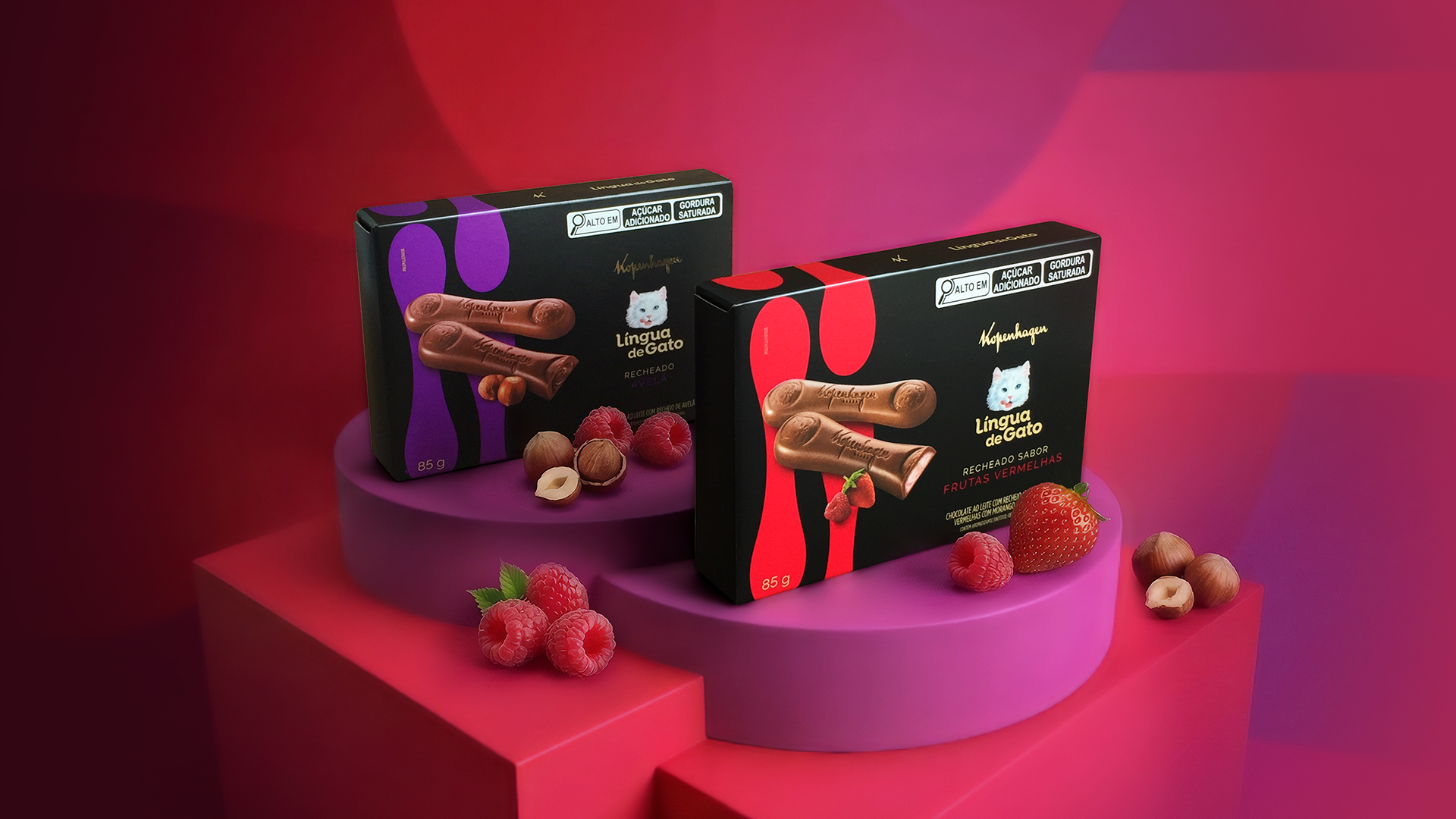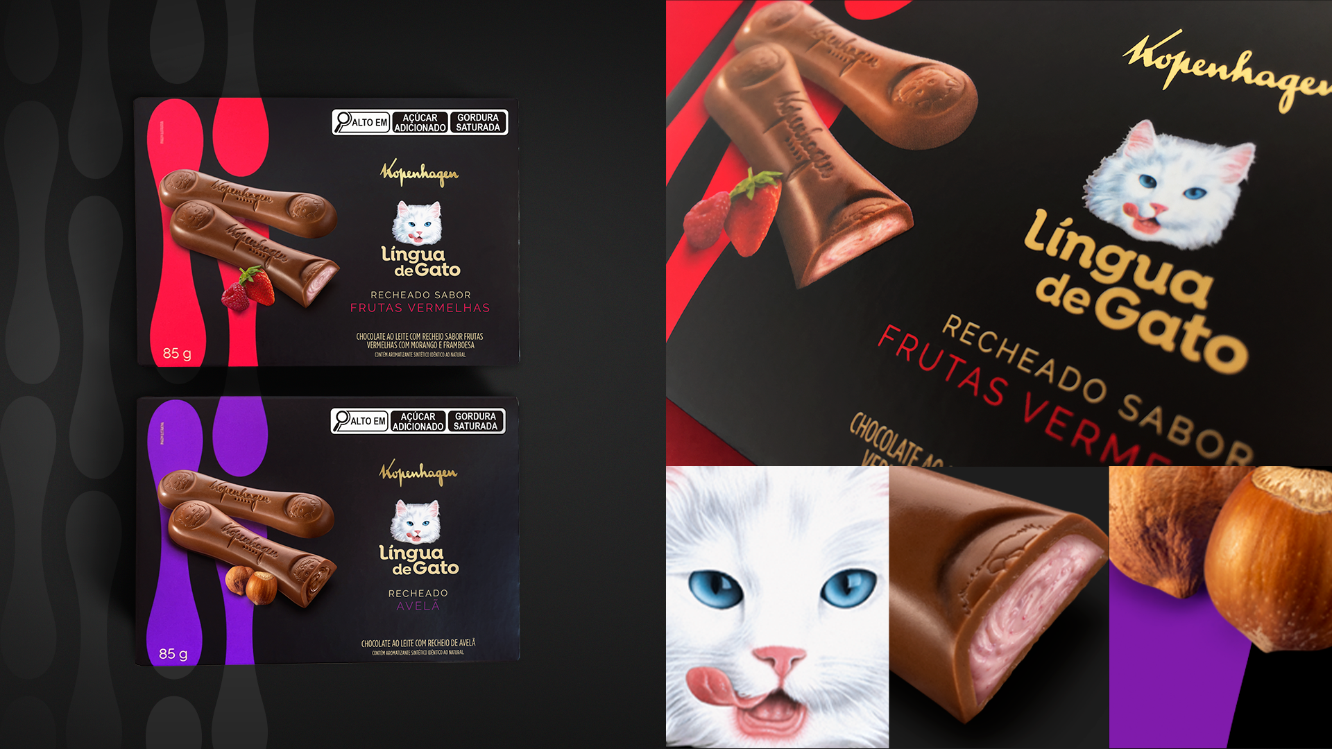 Kopenhagen Língua de Gato Recheado This packaging solution reimagines Kopenhagen’s iconic "Língua de Gato" silhouette through a vibrant chromatic strategy that translates flavors like hazelnut and red berries into a contemporary visual experience. The resulting design is a sensorial identity that balances tradition and innovation to stimulate consumer desire at first sight. Agency: Zaic Branding Client: Kopenhagen Creative Director: Érico Amorim Art Director/Graphic Designer: Érico Lebedenco Prepress: Robson Andrade