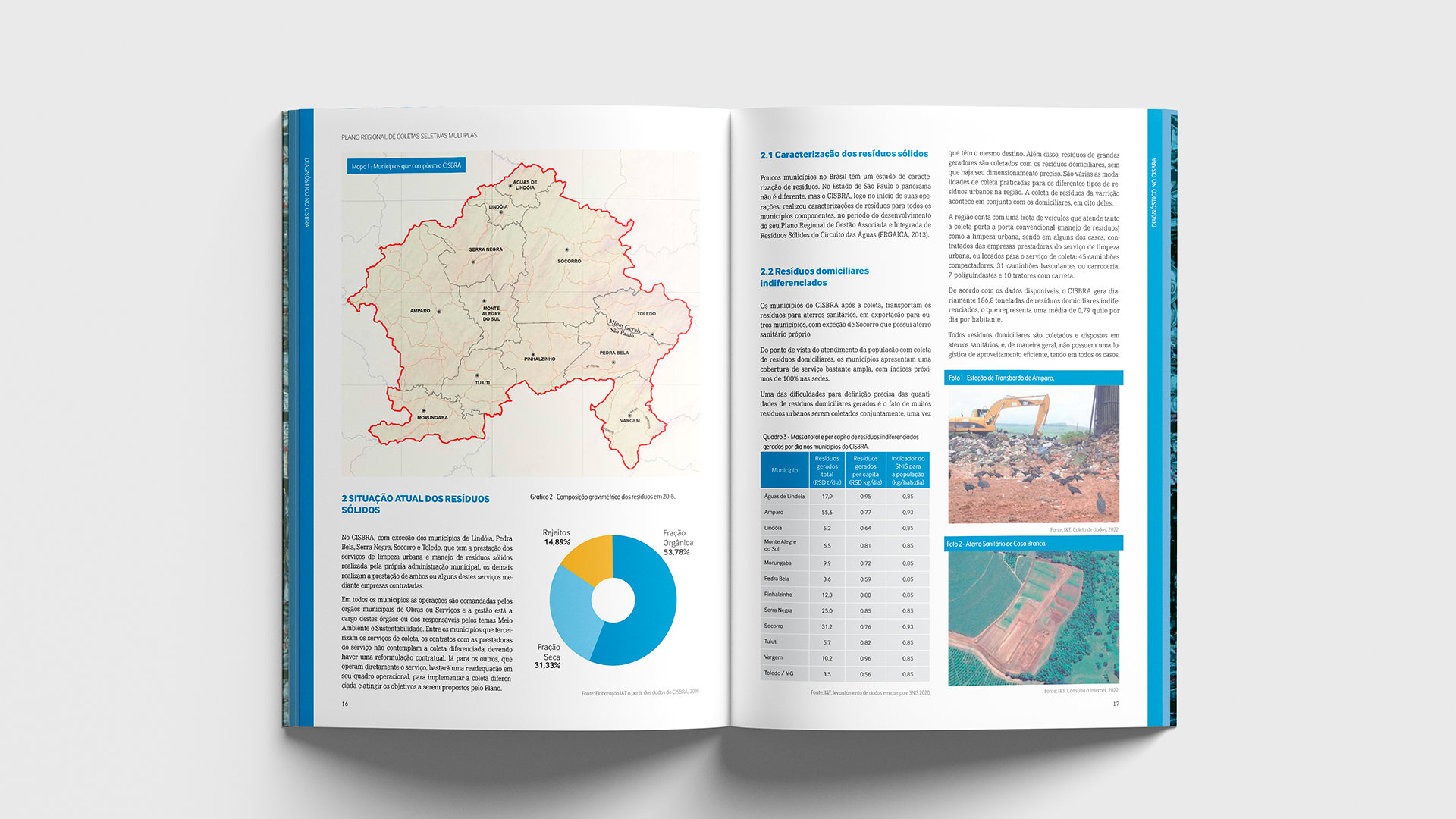 Strategic reports developed for SEBRAE and I&T Resíduos, featuring a functional visual language that simplifies complex technical data to support regional solid waste management. CONTENT DEVELOPMENT: I&T Gestão de Resíduos (Tarcísio de Paula Pinto, Angela Martins Baeder, Piero Pucci Falgetano, Rafael Guiti Hindi, Marisa Vieira de Jesus) GRAPHIC DESIGN: Érico Lebedenco ART ASSISTANT: Arthur Silva